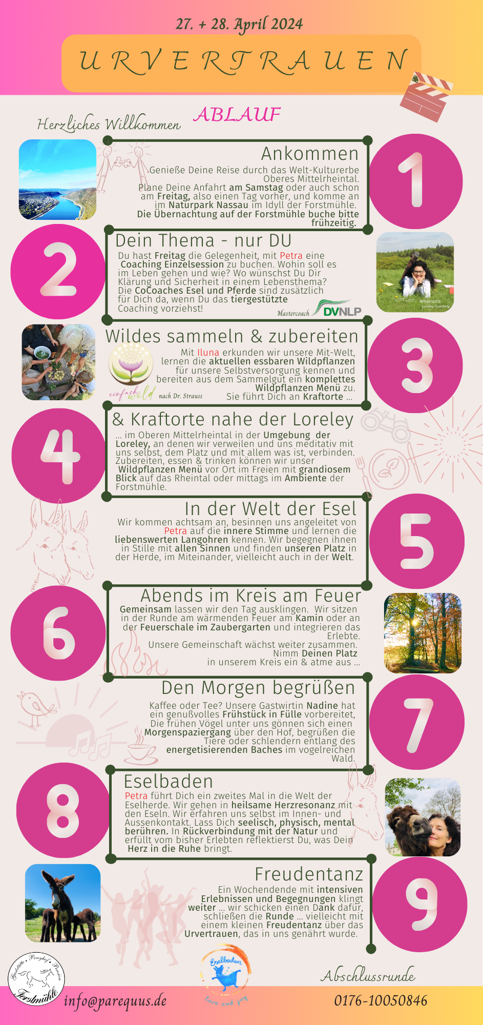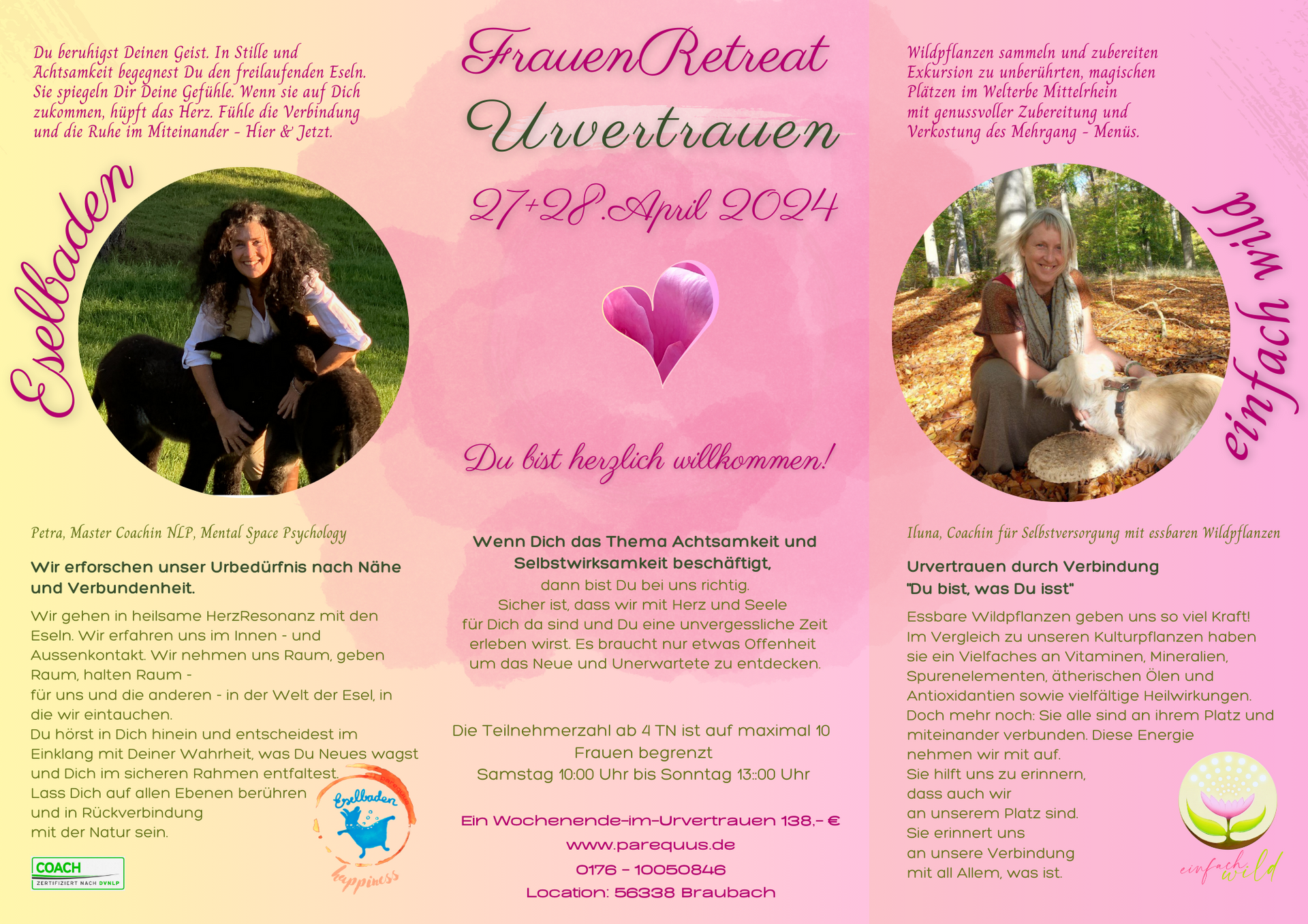 ich bin interessiertUrvertrauen II ꧁༺ Vertrauen braucht Zeit und Raum - wir gehen Schritt für Schritt und erkunden Aspekte der Vertrauensbildung in wohltuender und nährender Gesellschaft der wundervollen Esel. Wir integrieren unser Wissen über Selbstversorgung mit Wildpflanzen. Die Teilnahme ist besonders geeignet, wenn Du am Frauen Retreat April 2024 teilgenommen hast, jedoch ist das keine Voraussetzung für die Teilnahme. ꧁༺ Termin 16.08.-18.08. 2024